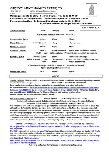 Article publié par response.text()) .then(text => { html = text showLoading = false; })" class="flex justify-center animate-grow-on-hover--small">Cathocambrai • Publié le Samedi 31 janvier 2026 - 15h46 • 10 visites 2606 Semaine du 31 janvier au 8 fevrier 2026 Télécharger 183.1 Ko Télécharger