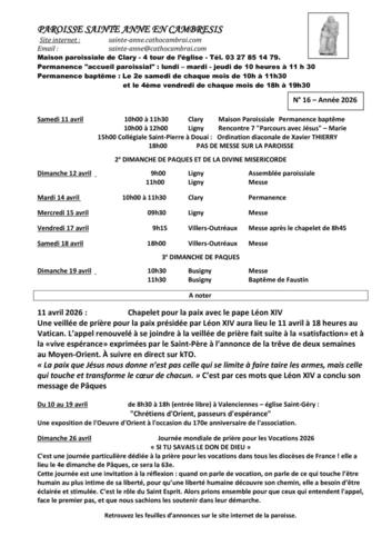 Article publié par response.text()) .then(text => { html = text showLoading = false; })" class="flex justify-center animate-grow-on-hover--small">Cathocambrai • Publié le Samedi 11 avril 2026 - 15h47 • 19 visites 2616 Semaine du 11 au 19 avril 2026 Télécharger 289.5 Ko Télécharger