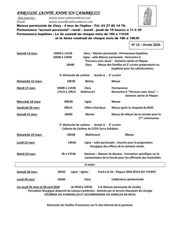 Article publié par response.text()) .then(text => { html = text showLoading = false; })" class="flex justify-center animate-grow-on-hover--small">Cathocambrai • Publié le Samedi 14 mars 2026 - 14h54 • 6 visites 2612 Semaine du 14 au 22 mars 2026 Télécharger 236.5 Ko Télécharger