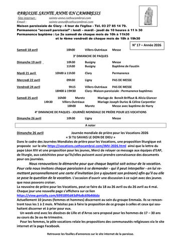 Article publié par response.text()) .then(text => { html = text showLoading = false; })" class="flex justify-center animate-grow-on-hover--small">Cathocambrai • Publié le Samedi 18 avril 2026 - 15h25 • 3 visites 2617 Semaine du 18 au 26 avril 2026 Télécharger 291.2 Ko Télécharger