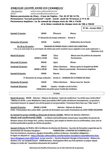 Article publié par response.text()) .then(text => { html = text showLoading = false; })" class="flex justify-center animate-grow-on-hover--small">Cathocambrai • Publié le Samedi 17 janvier 2026 - 15h33 • 5 visites 2604 Semaine du 17 au 25 janvier 2026 Télécharger 183 Ko Télécharger