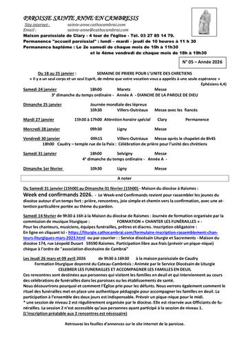 Article publié par response.text()) .then(text => { html = text showLoading = false; })" class="flex justify-center animate-grow-on-hover--small">Cathocambrai • Publié le Samedi 24 janvier 2026 - 11h02 • 24 visites 2605 Semaine du 24 janvier au 1er fevrier 2026 Télécharger 196.3 Ko Télécharger